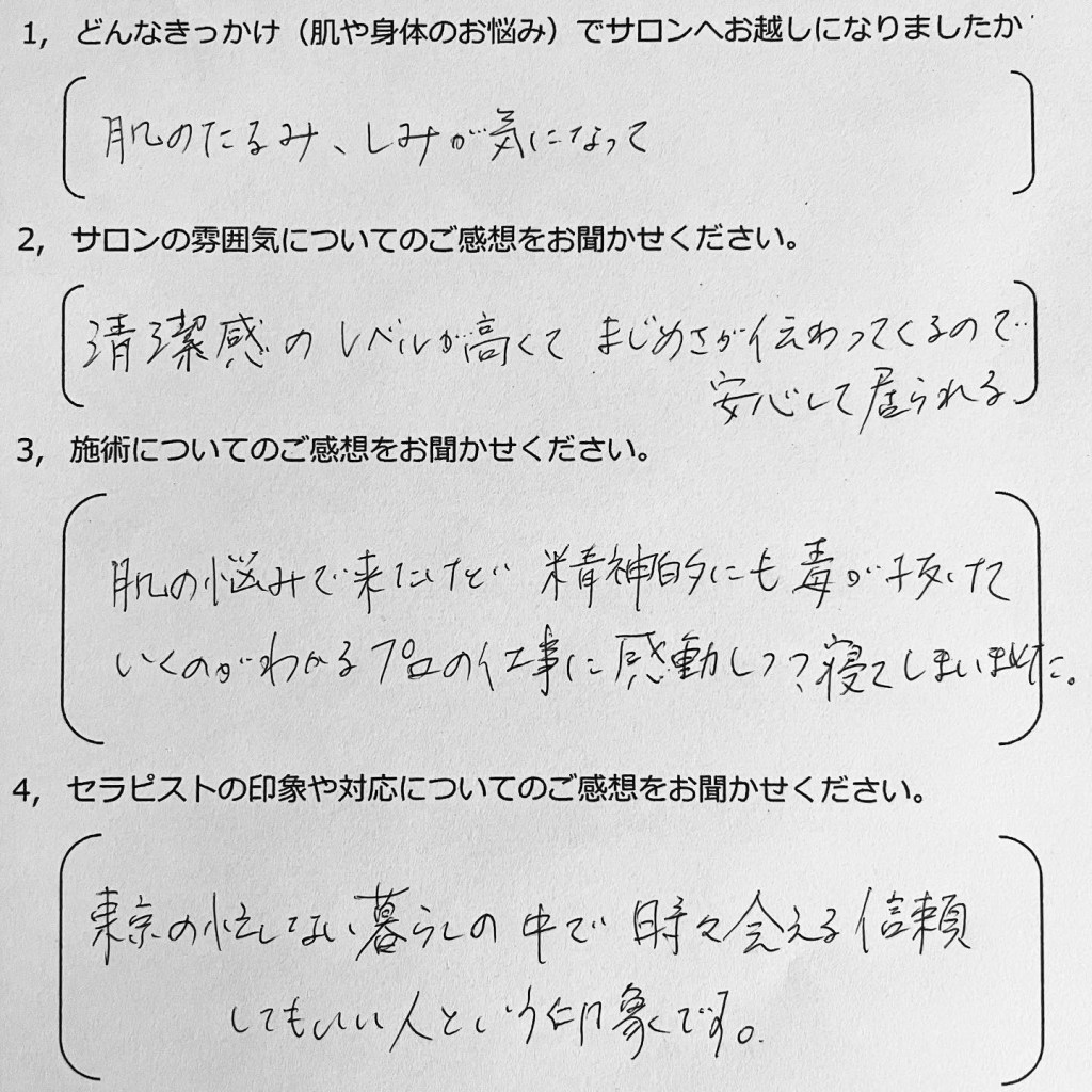 先日、3回目のご来店の際にご丁寧にコメントをくださいました。代々木上原でお仕事をされているそうで、月に1~2回のペースで定期的にお越しくださっています。コロナ禍でオンラインでお客様と接することが増え、自分の顔を客観的に見ることで、たるみやシミが気になり出したそうで、サロンにご来店くださいました。最近、サロンに通っていることも、化粧品を変えたことも知らないご主人から、「なんか肌変わった?白くなったような…」と言われたそうで。身近な人に変化を気づいてもらえると、嬉しいですね!先の見えない不安なご時世なので、どんな方も少なからずストレスを抱えていると思います。このような時だからこそ、お肌やお身体のケアはもちろん、サロンでお過ごし頂くお時間が少しでも心が緩む癒しの時間となれれば幸いです。