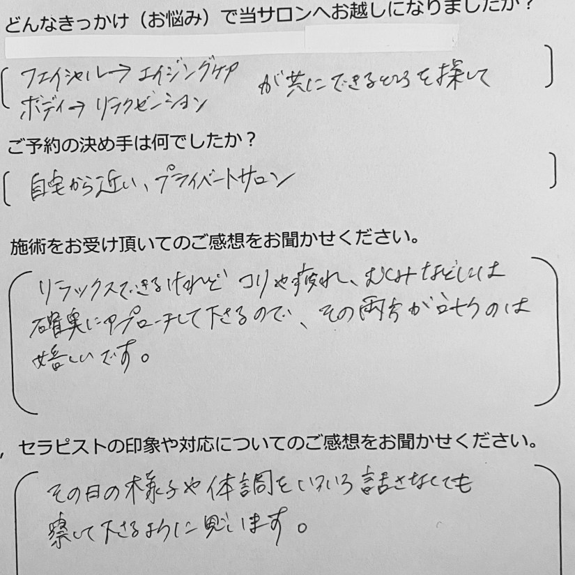 リラックスできるけれど、コリや疲れ、むくみなどには確実にアプローチして下さるので、その両方が叶うのは嬉しいです。