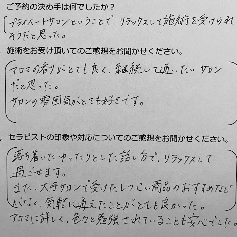 アロマの香りがとても良く、継続して通いたいサロンだと思った。