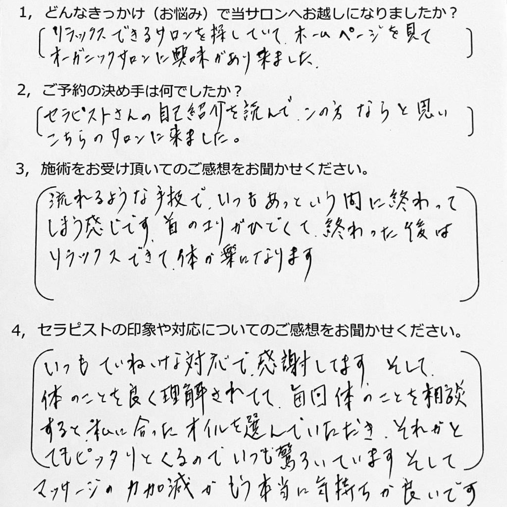 いつも丁寧な対応で感謝しています。体のことを良く理解されていて、毎回体のことを相談すると、私に合ったオイルを選んでくださり、それがとてもピッタリくるので、いつも驚いています。マッサージの力加減がもう本当に気持ちが良いです。