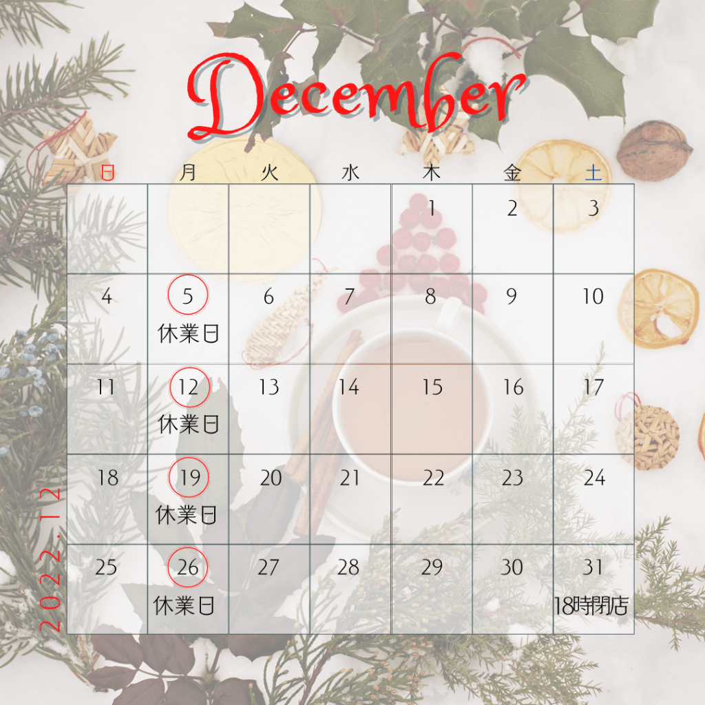 12月の休業日および年末年始の営業は下記の通りとなります。