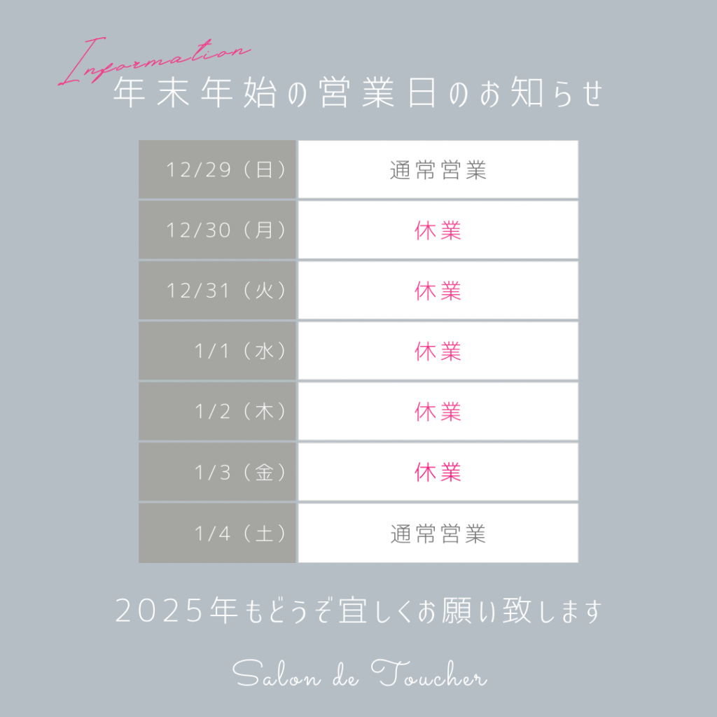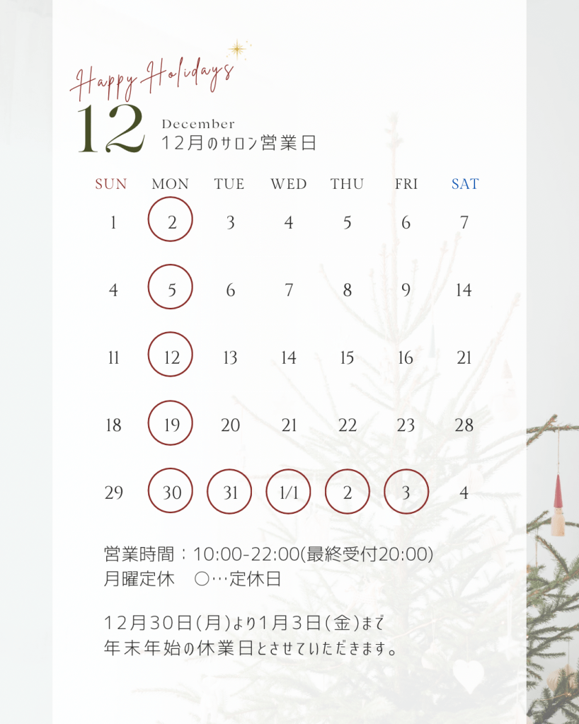 12月は何かと慌ただしくなるかと思いますが、一年のお疲れを癒しに、一年の締めくくりのサロンケアにぜひいらしてくださいね。